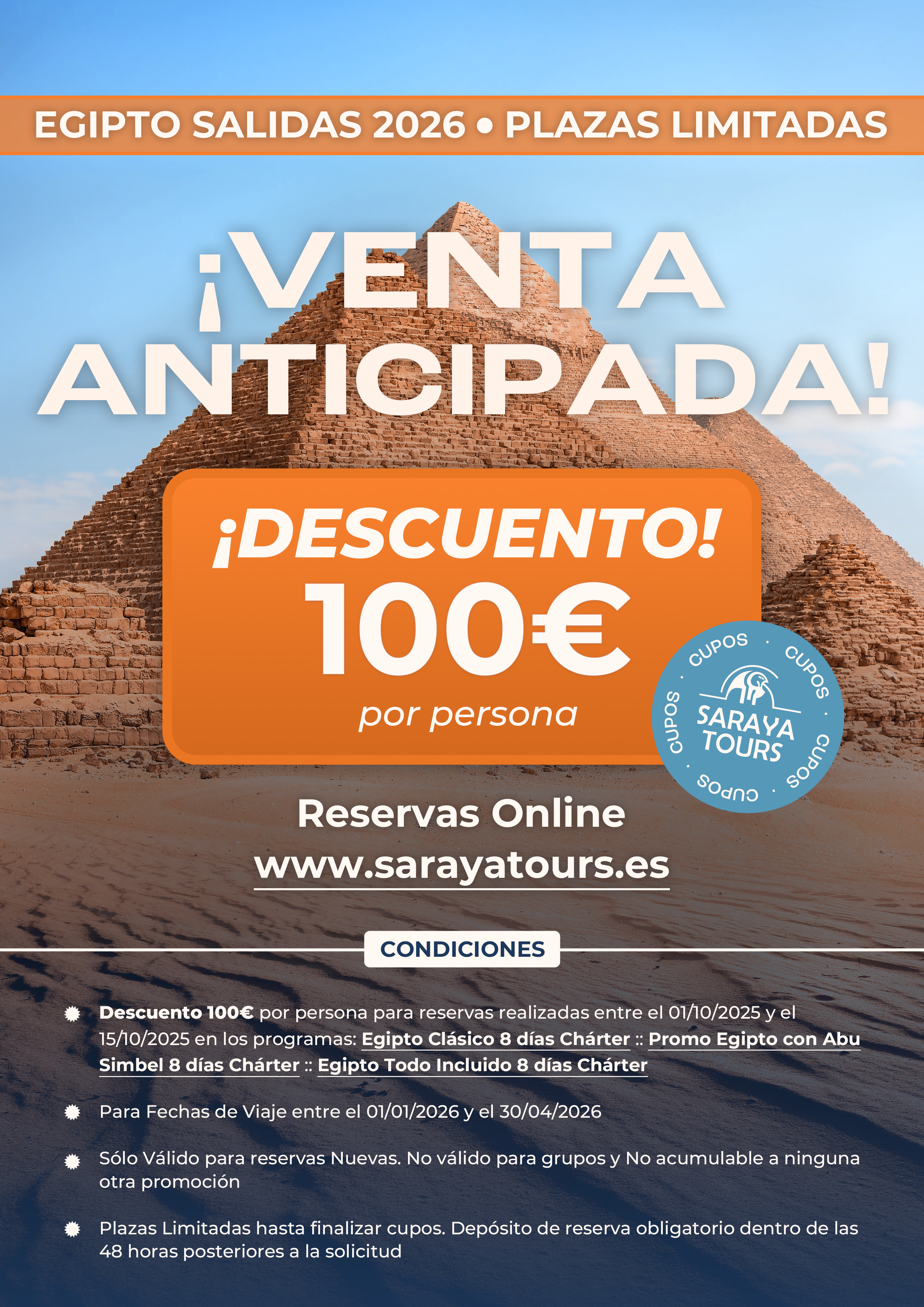 ¡¡¡Venta Anticipada EGIPTO!!! Descuento 100 € p.persona. Salidas 01/01/26 al 30/04/26. Consultar condiciones.